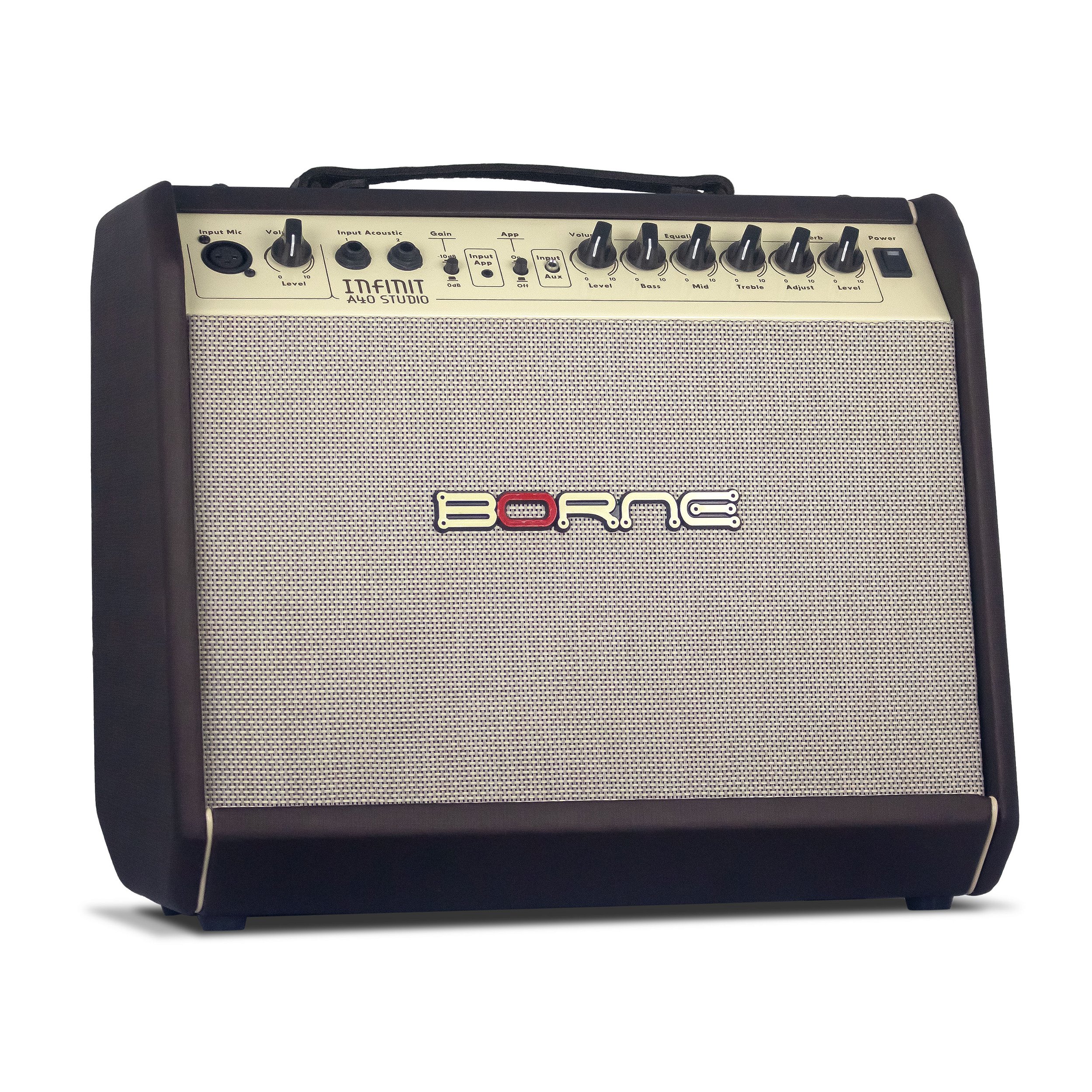 - Controle de grave, médio, agudo e volume do instrumento acústico e da entrada auxiliar