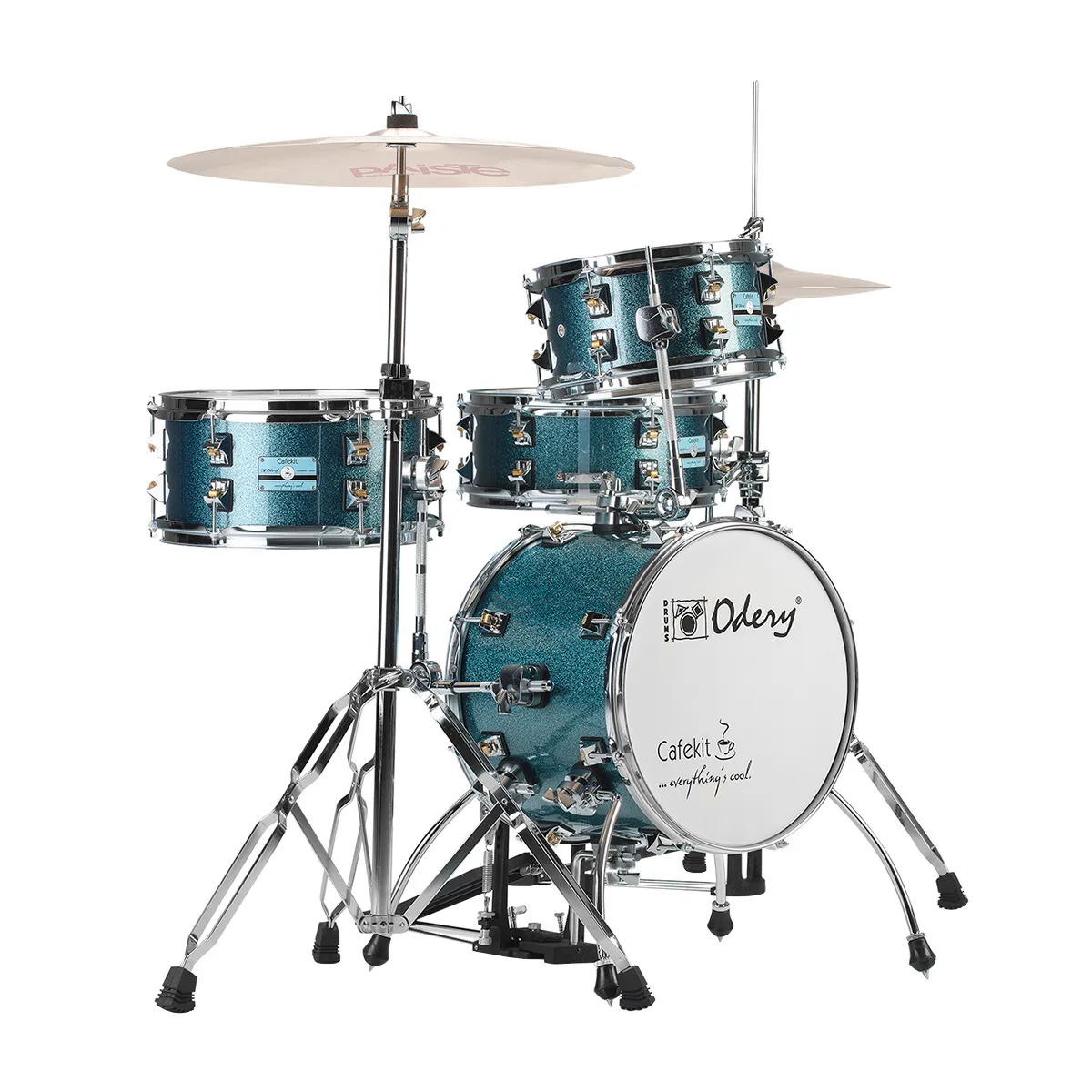 - Marca: Odery; - Linha: Café Kit; - Modelo: CAFE-KIT-BS; - Cor: Blue Sparkle; - Peças: 4; - Bumbo: 14” x 11”; - Caixa: 12” x 05”; - Tom: 10” x 5,5”; - Surdo: 12” x 06”.